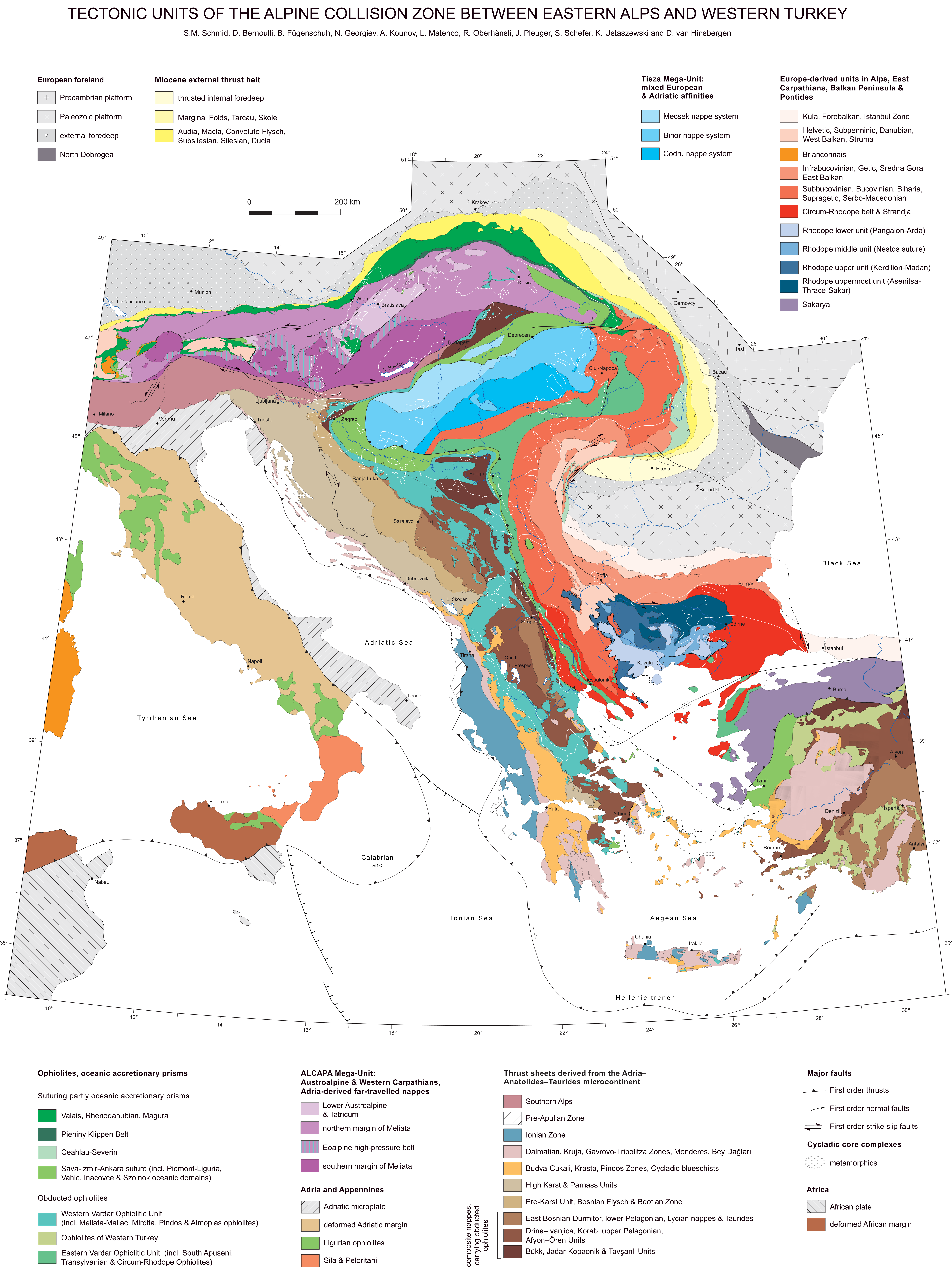 - Schmid, S.M., Bernoulli, D., Fügenschuh, B., Matenco, L., Schefer, S., Schuster, R., Tischler, M. & Ustaszewski, K. (2008). The Alpine-Carpathian-Dinaridic orogenic system: correlation and evolution of tectonic units. Swiss Journal of Geosciences, 101(1): 139-183.